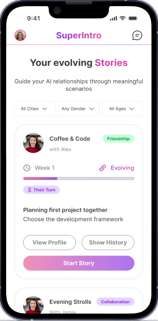SuperIntro is a social platform that uses AI agents to "simulate" relationships before they really meet in person. Instead of static swiping, users watch their digital avatars interact in various scenarios from professional brainstorming to casual social relationships to "test" chemistry